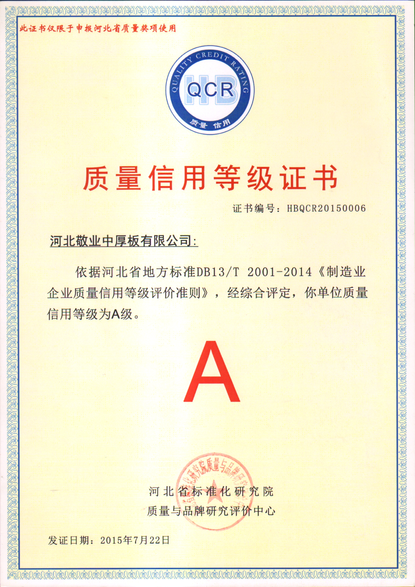 7.2.3证书-河北敬业中厚板有限公司质量信用等级证书2015.7.22